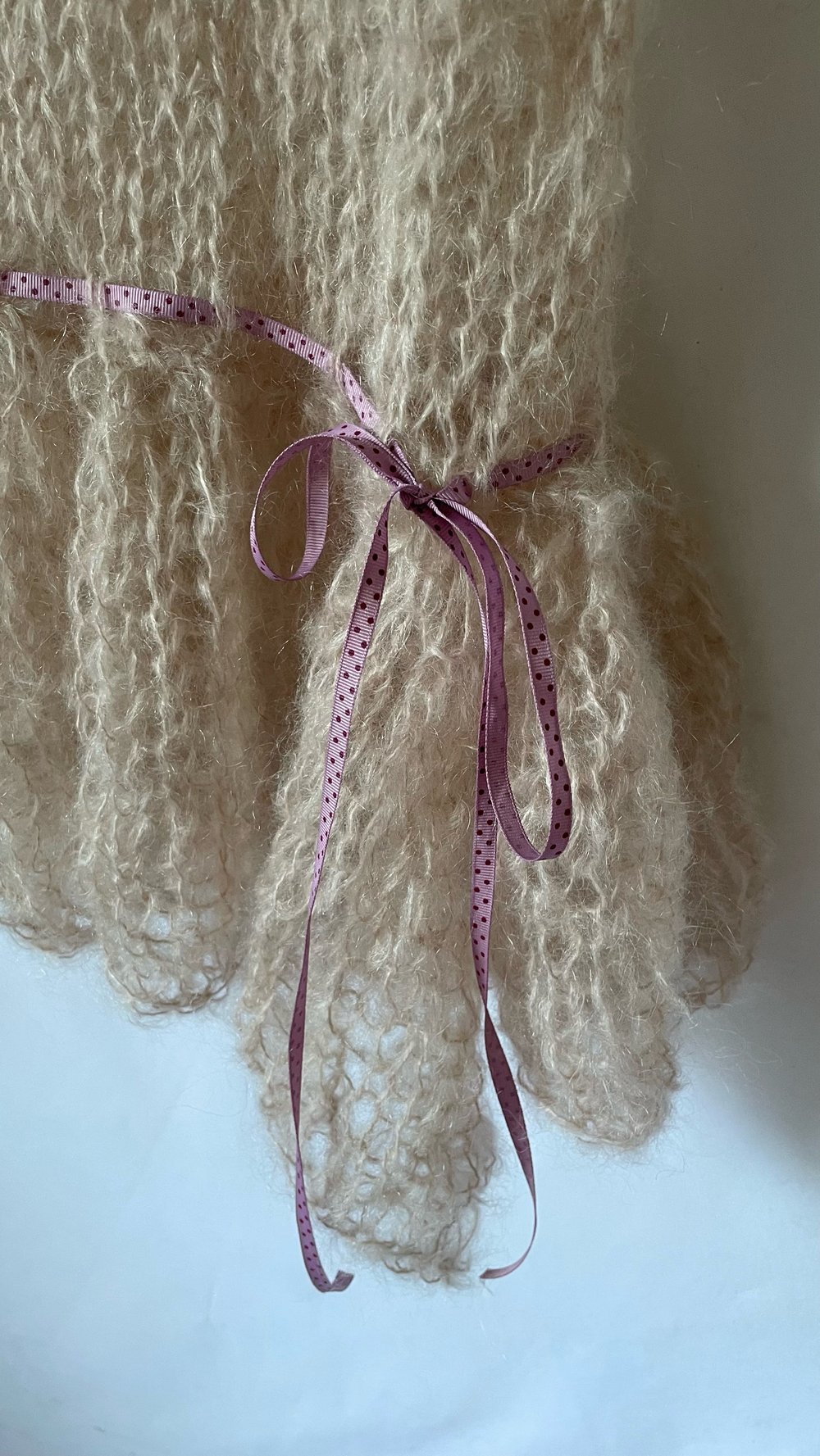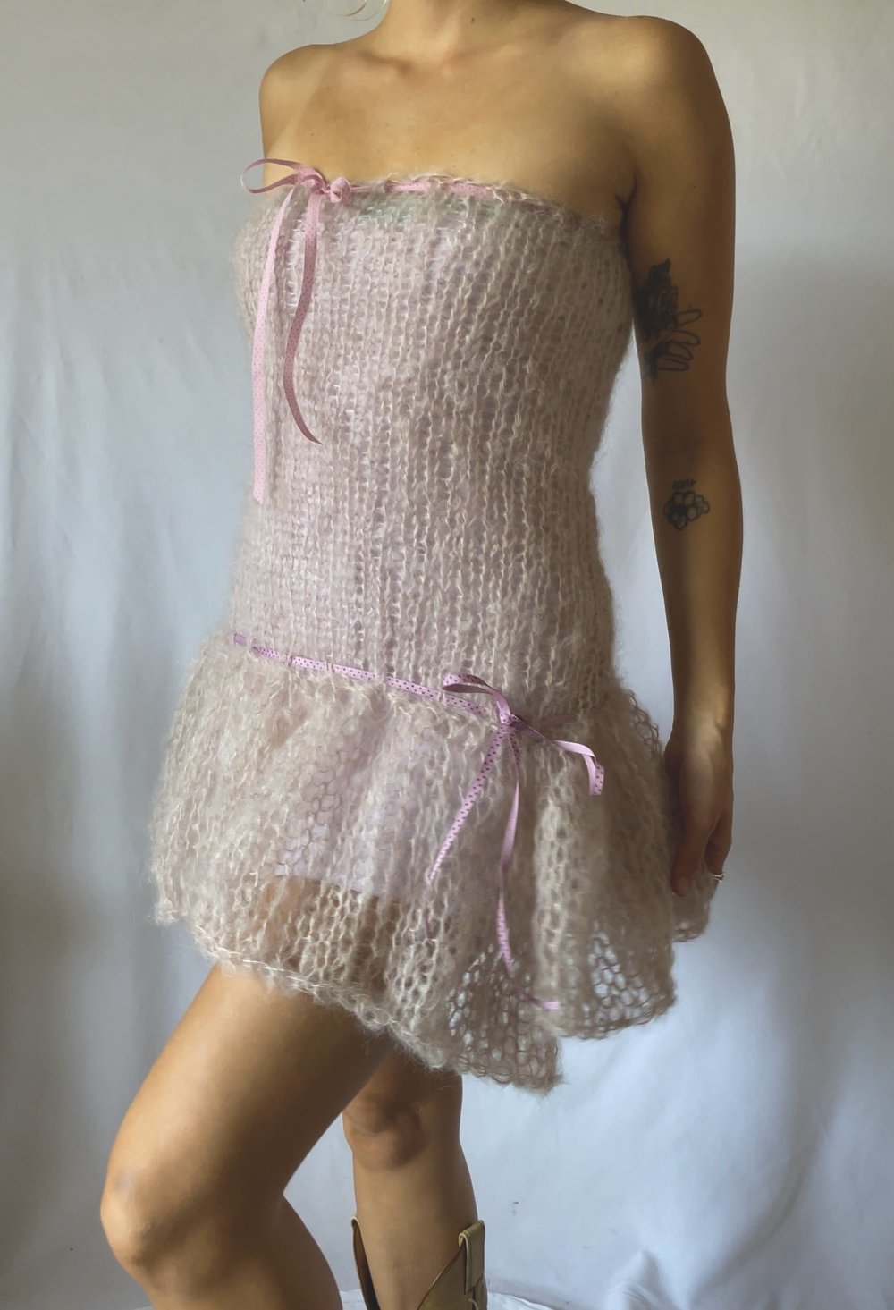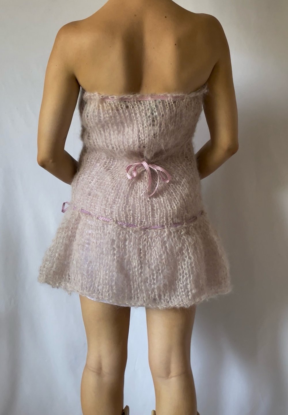 pink mohair drop waist dress with double ribbon ties and tie in the back <3 semi see thru
