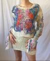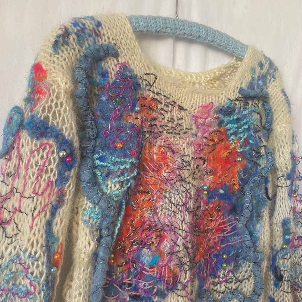 cream knit wool sweater with bell sleeves, wool felted blue orange pink design, beads and more!