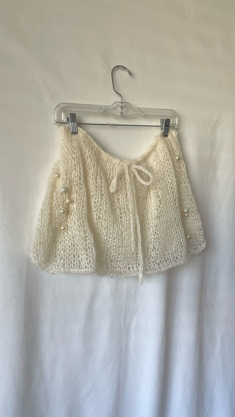 cream and white knit skirt with random pearl beading - handmade with a semi bubble skirt looks and crochet bow tie for adjusting