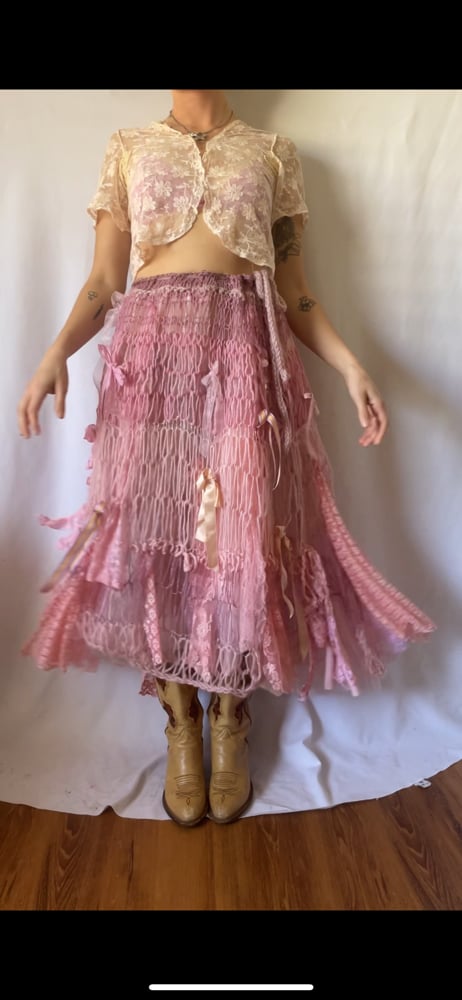 hand knit maxi with adjustable waist and sheer / lace undertones along with silk ribbon bows and some sequin detail :)